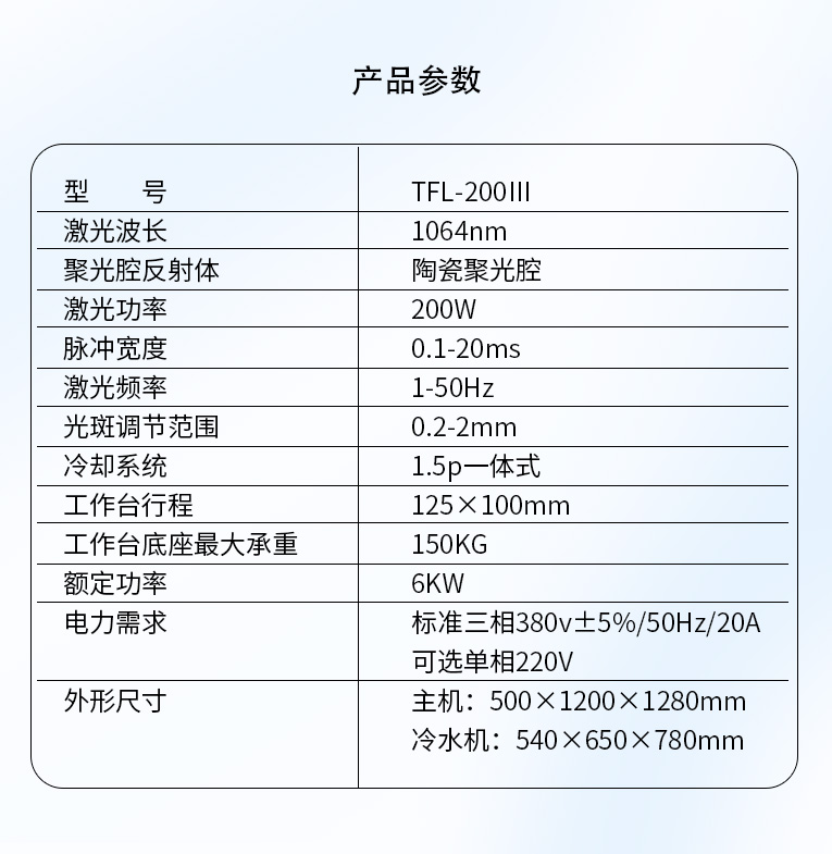 TFL-200Ⅲ型模具激光焊機(jī)是通發(fā)激光公司在TFL-180Ⅲ的基礎(chǔ)進(jìn)行了改良,采用通發(fā)自主研發(fā)的二代精密單燈電源為燈泵浦驅(qū)動(dòng)電源,配置觸摸屏,操作更方便。主機(jī)具備激光頭手搖升降與工作臺按鈕電動(dòng)升降實(shí)現(xiàn)焊接不同厚度模具的激光焊加工。本款機(jī)型更適用于各類高精密注塑模具激光補(bǔ)焊,精密塑膠模具零件激光修補(bǔ),塑膠模具鈹銅零件激光燒焊;可對模具使用過程中出現(xiàn)的磨損進(jìn)行激光修復(fù);對機(jī)械加工失誤、電火花加工失誤,模具減膠設(shè)計(jì)變更等需要對模具修改,起到關(guān)鍵的作用,可彌補(bǔ)因加工失誤造成的巨大損失。