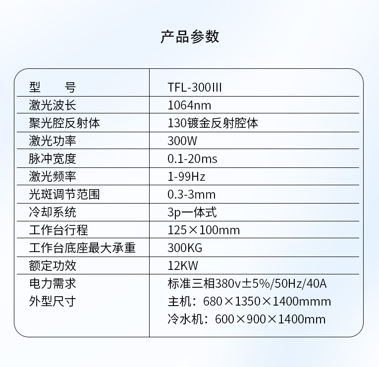 TFL-300Ⅲ型模具激光焊機是通發激光公司自主研發的一款大功率激光焊接機,采用通發自主研發的二代精密雙燈電源為燈泵浦驅動電源,配置觸摸屏,操作更方便。主機具備激光頭手搖升降與工作臺按鈕電動升降實現焊接不同厚度模具的激光焊加工。本款機型更適用于各類大功率、大面積激光修補的模具。由于激光功率大,同時可激光焊接鈹銅模具,鋁材模具或鋁材零件。在大面積激光修補模具時,可以使用更粗的焊絲,激光焊接效率大幅提升。